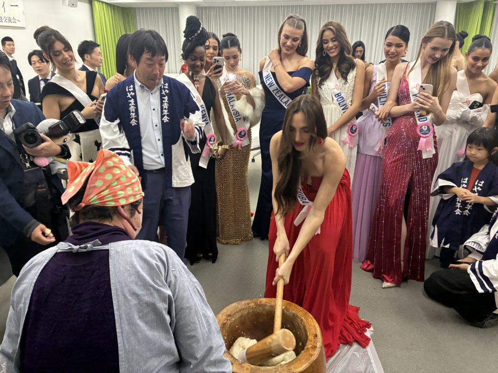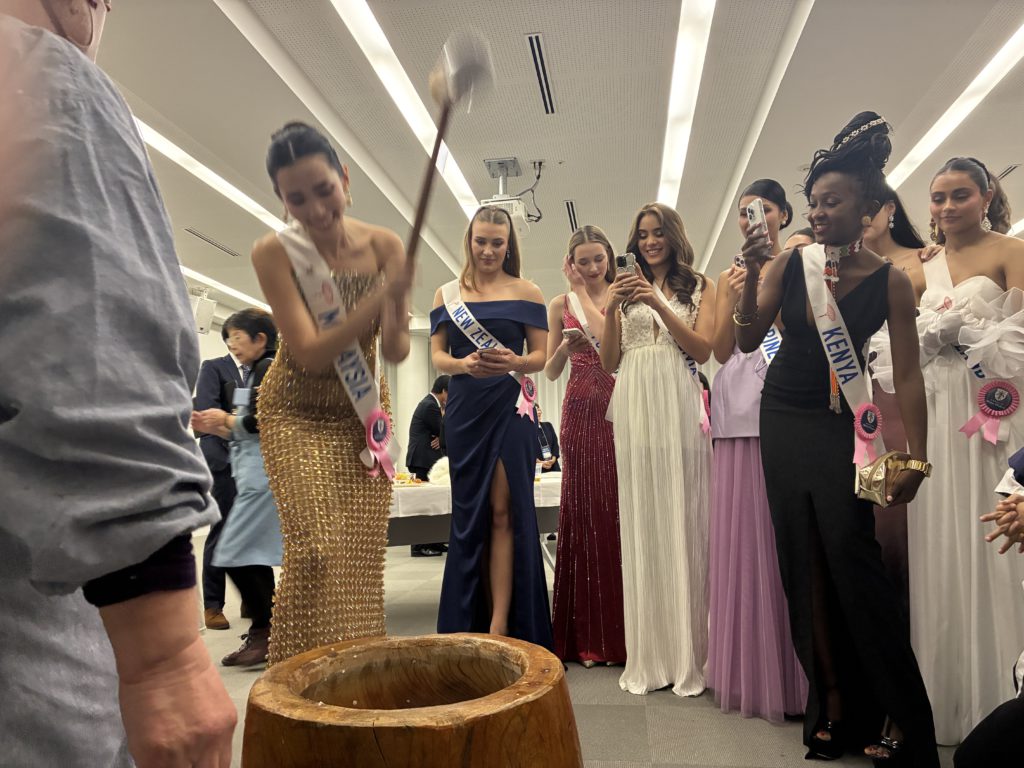 ミス達は麓山神社保存会による獅子舞や、富岡町のお米を使った餅つきなどを楽しみました。