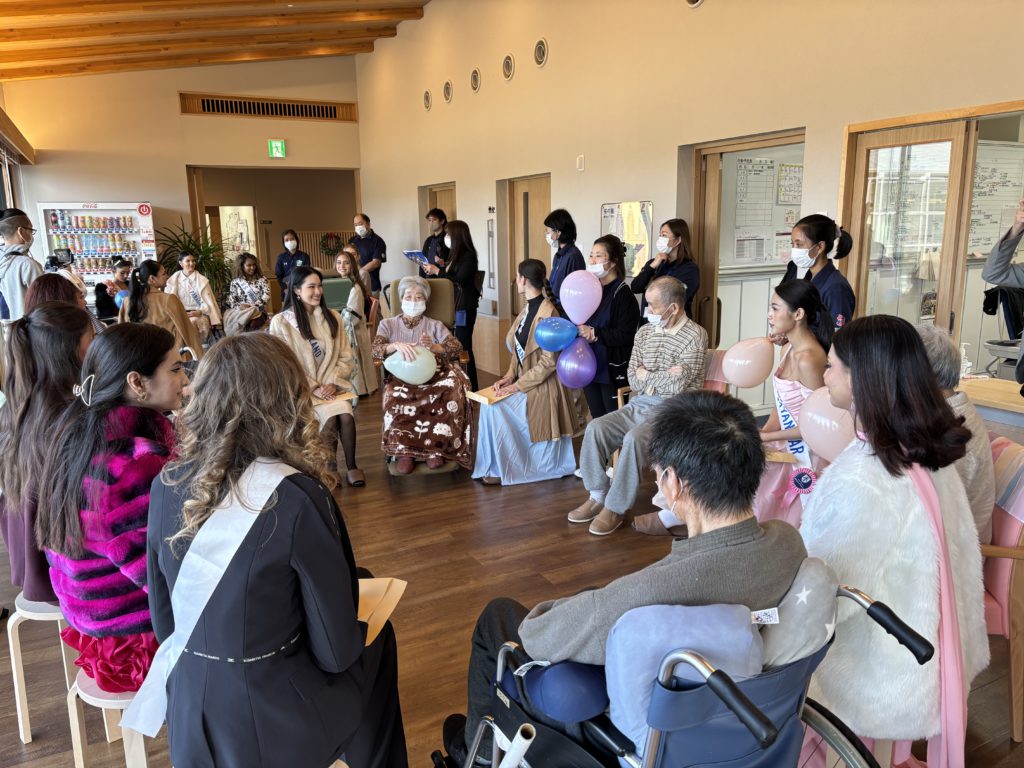 ミス達はその後、特別養護老人ホーム桜の園で施設の取り組みを聞き、入所している高齢者とも触れ合い、優しく声をかけるなどしました。