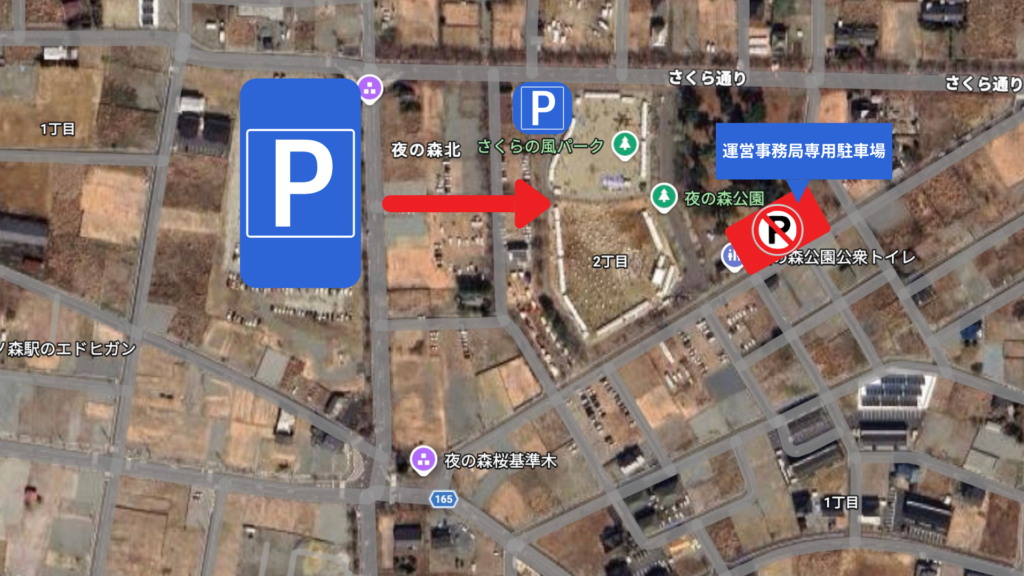 ご来場の方は、北側か旧リフレ富岡跡地の駐車場をご利用ください。